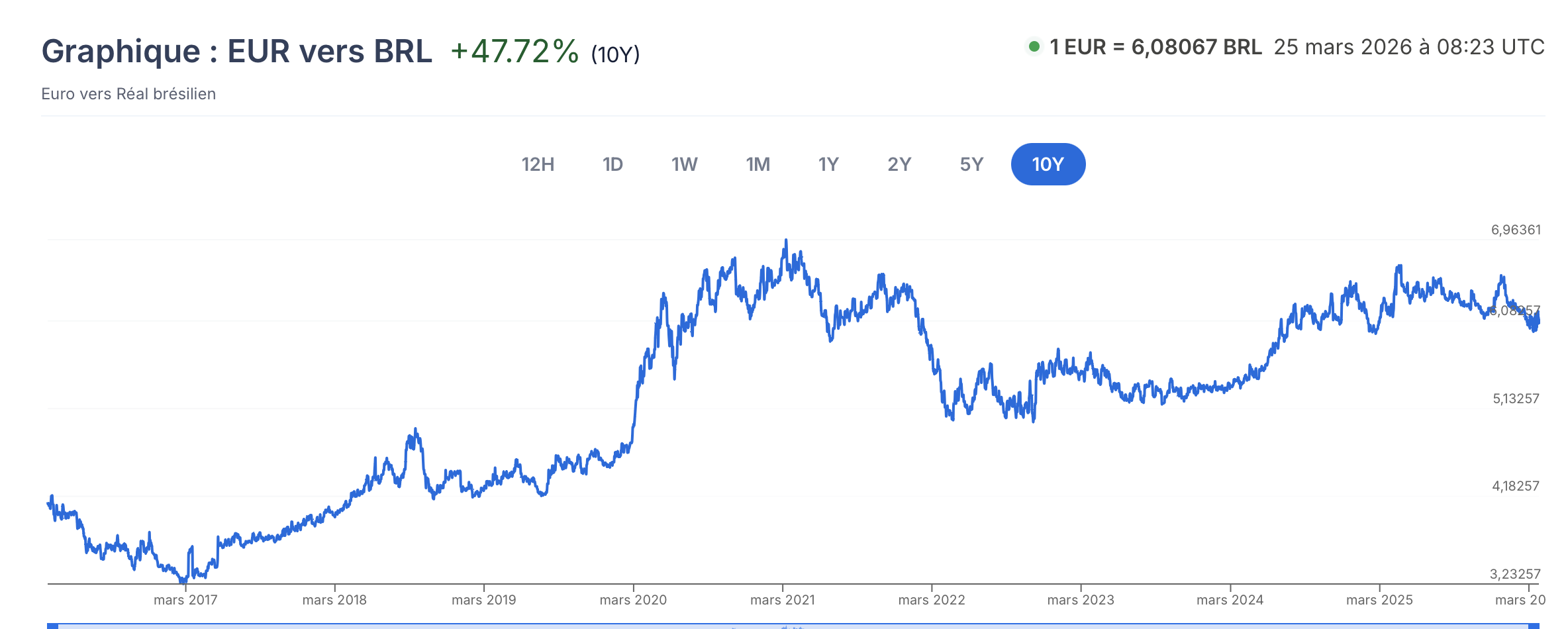Depuis le début 2011, le Real brésilien a perdu plus de 8 % de sa valeur en passant d’un Taux de 2,1730 le 8 janvier 2011 à un taux actuel de 2,3474 pour 1 Euro.