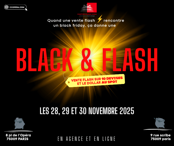 Black & Flash CCO, c’est la rencontre du Black Friday avec une vente flash CCO. Cette année nous avons décidé de regrouper les deux événements en un seul. Nous aurons donc d’une part le Black Friday sur le dollar américain et d’une autre part la vente flash sur une sélection de devises.