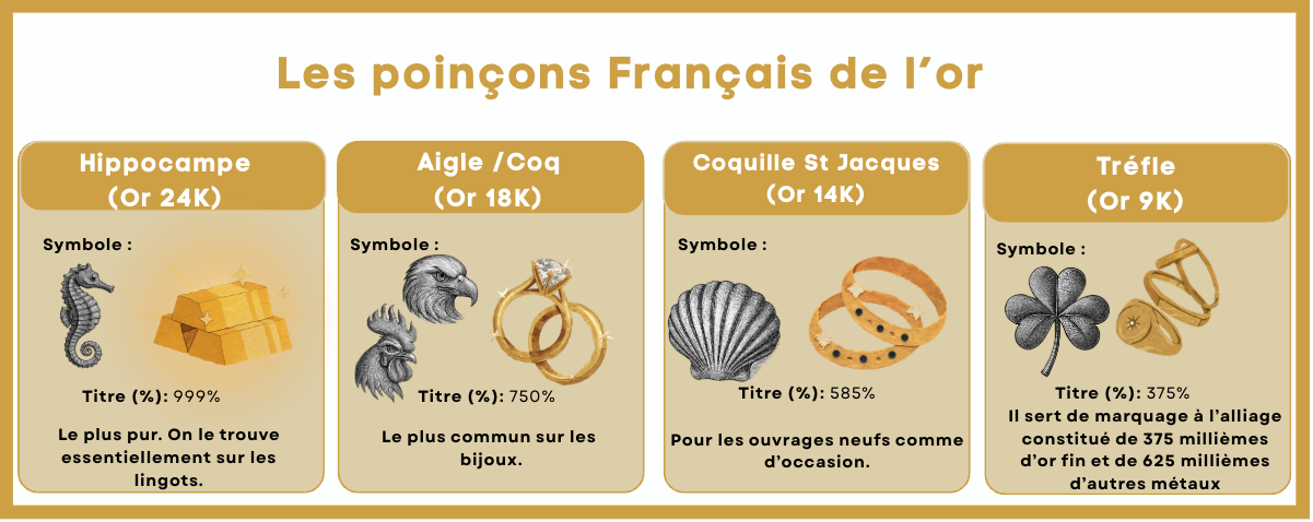 En France, l’or est identifié par un symbole officiel (et non un simple chiffre comme 750 ou 18k). Chacun de ces symboles correspond à une teneur précise en métal précieux.