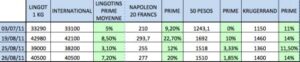 • Cas du lingot de 1 kilo : En passant de 33290 à 40500 €, la hausse du lingot est de l’ordre de 21 % en 2 mois. Il a été surcoté sur le marché parisien CPoR par rapport au marché international (cotation de Londres).